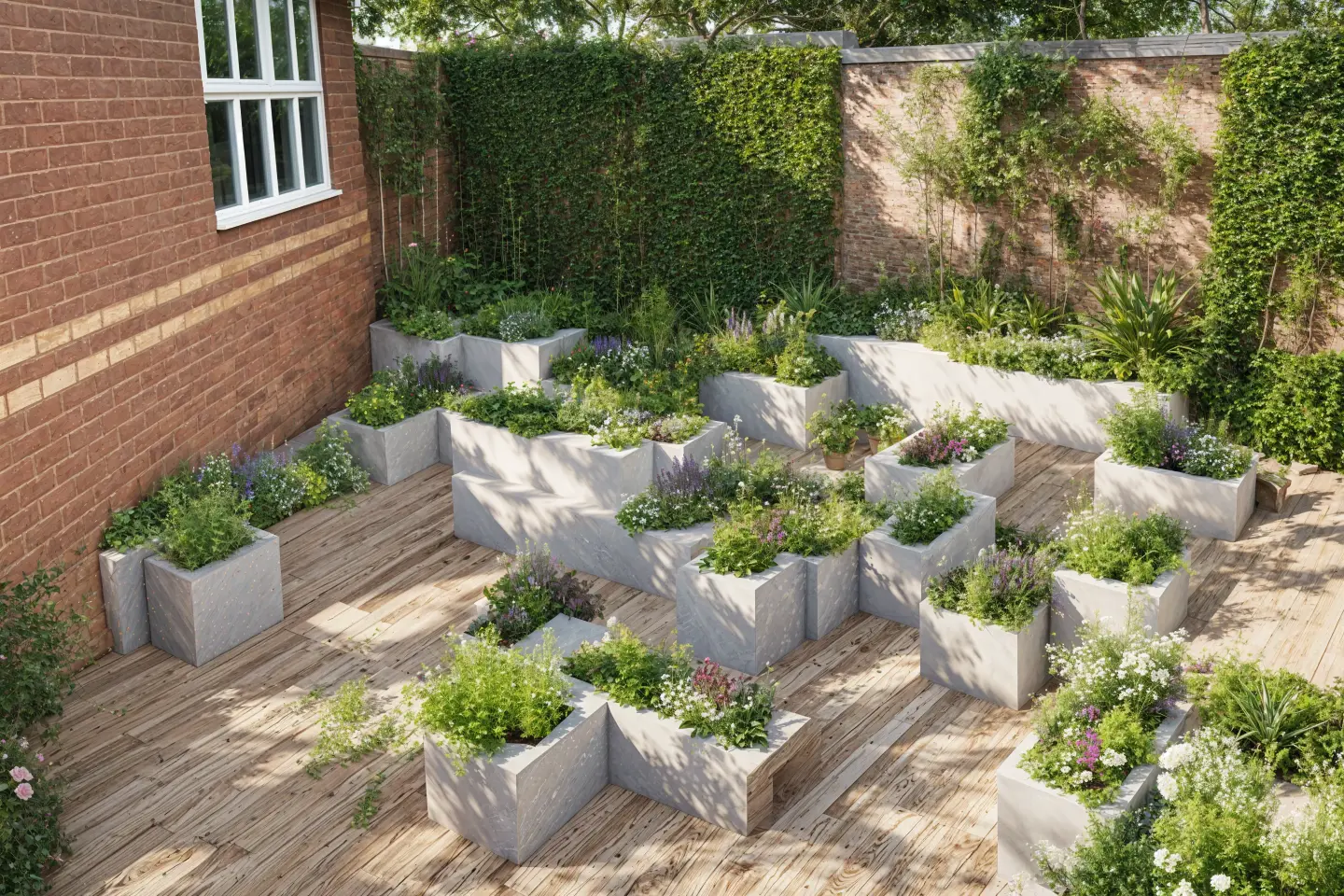Compact planting and layering — Combining tall, medium, and low-height plants to create a layered effect: useful for privacy, shade, and visual interest even in tight spaces.