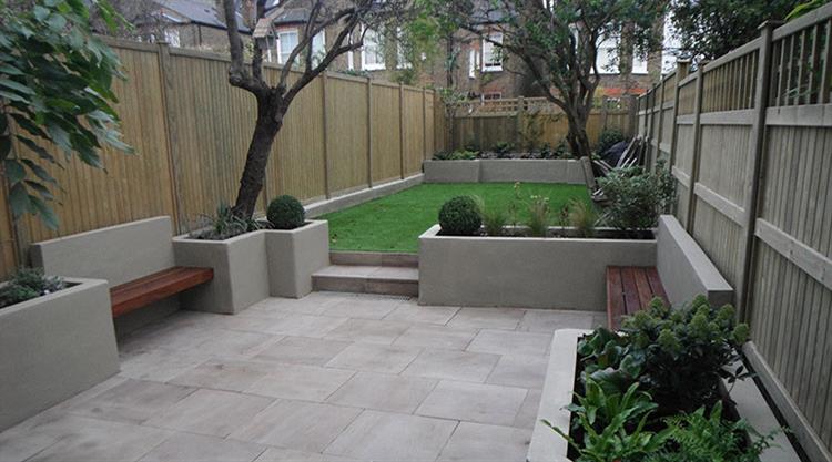Hardscape features: paving or decking for seating/paths; fences or walls for privacy or boundary; containers and raised beds if ground soil is poor or absent.